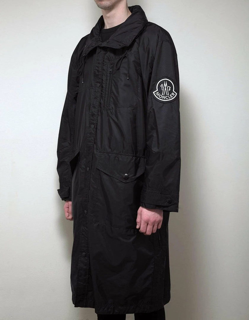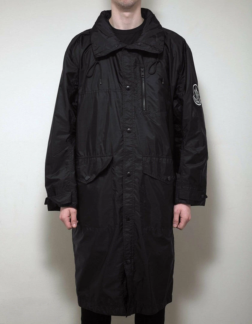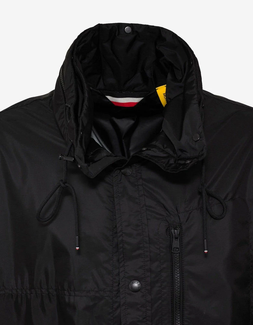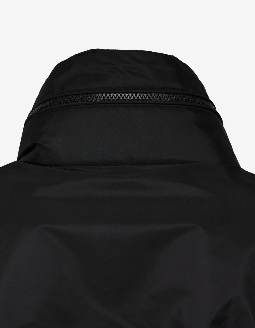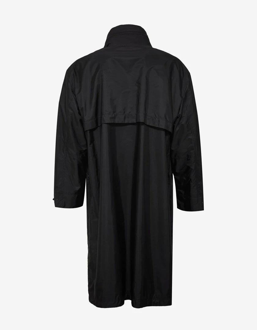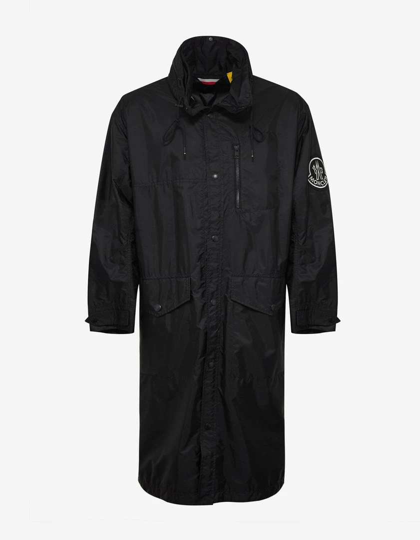 - Nylon long coat/parka with tuckaway hood
