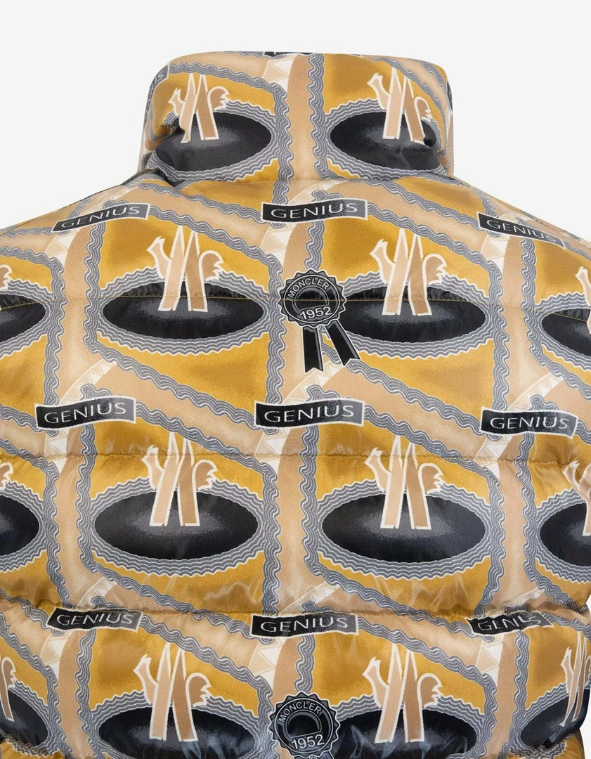 A nylon laqué “Genius” print and contrast lining are delivered in the Parker gilet from 2 Moncler 1952, collection n° 2 of the Moncler Genius project. Fergus Purcell collaborates to create a winning style for a streetwear look.