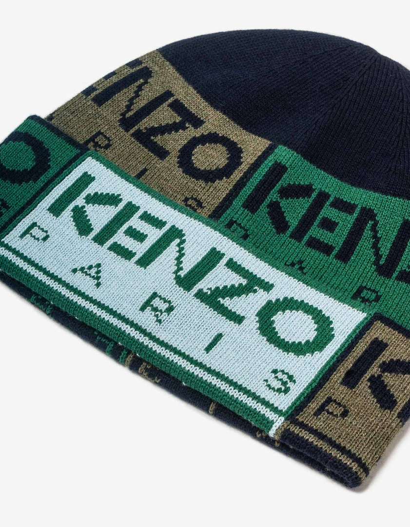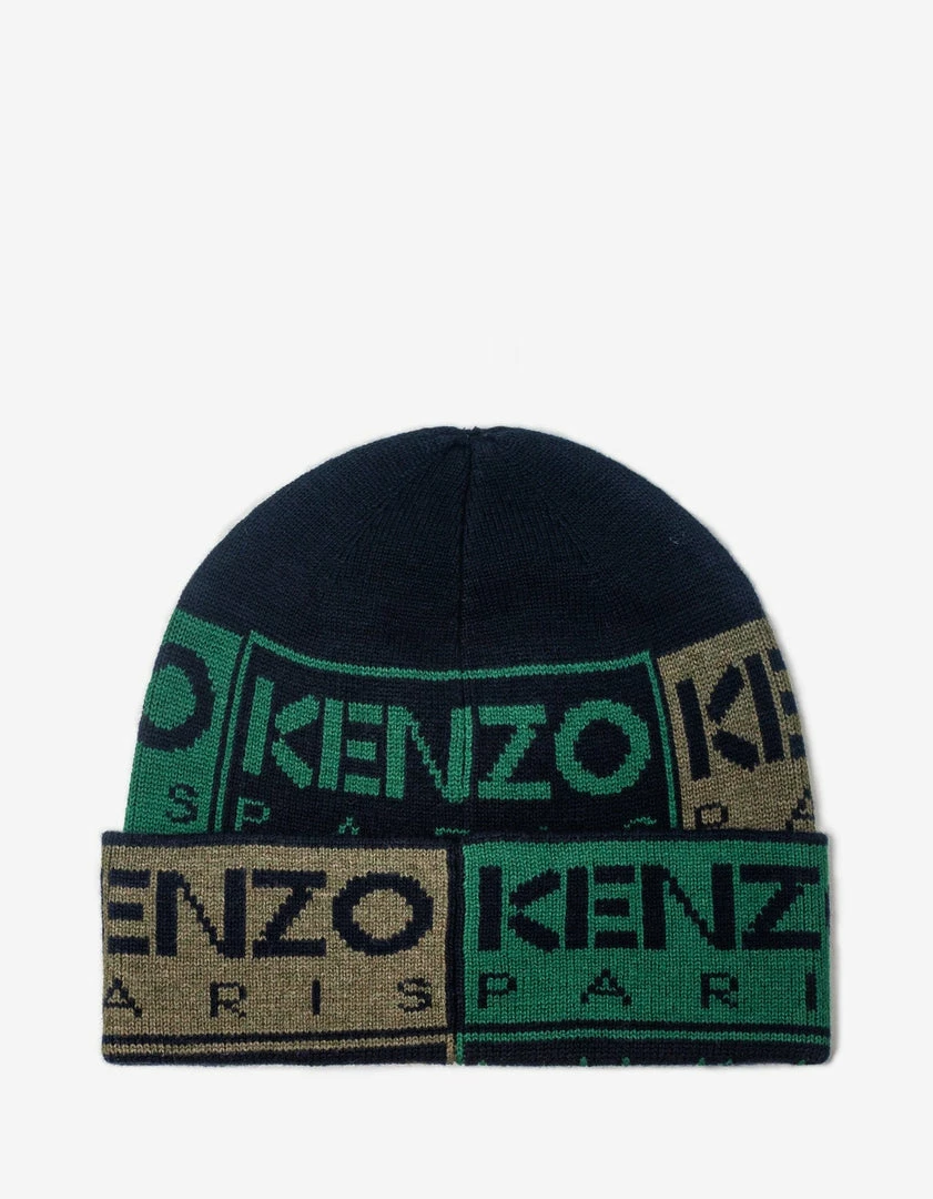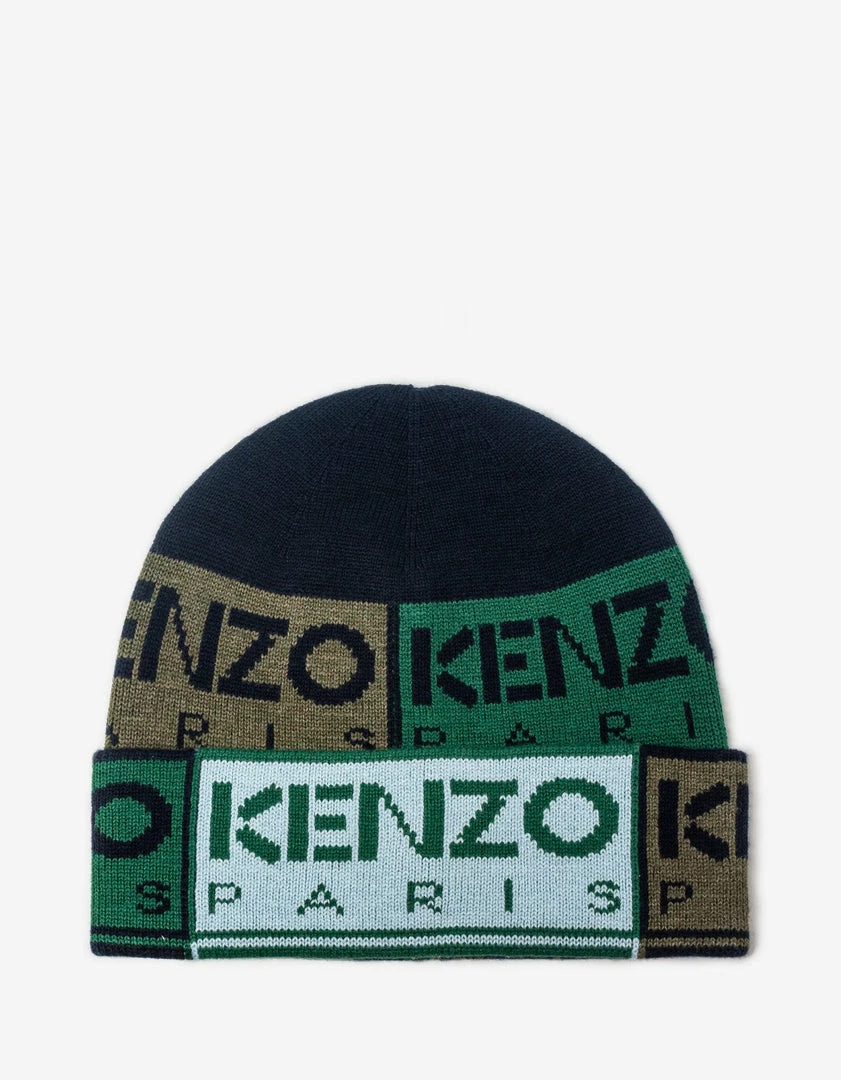 This KENZO Box wool cap, which features a mix of sportswear and retro patchwork inspirations, embodies the authentic style of the House. The KENZO Paris logo appears in multiple colours over two-thirds of the surface.