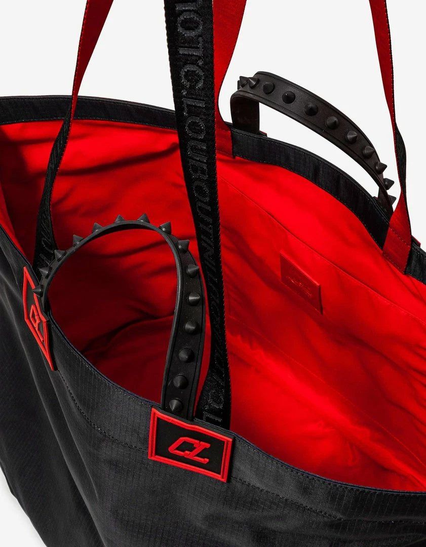 The modern Loutote Beach bag enchants with its summery appeal. This model is crafted inΒ black nylon and features the signature black spikes and the Maison Christian Louboutin logo. The practical design can be carried by hand or worn over the shoulder.