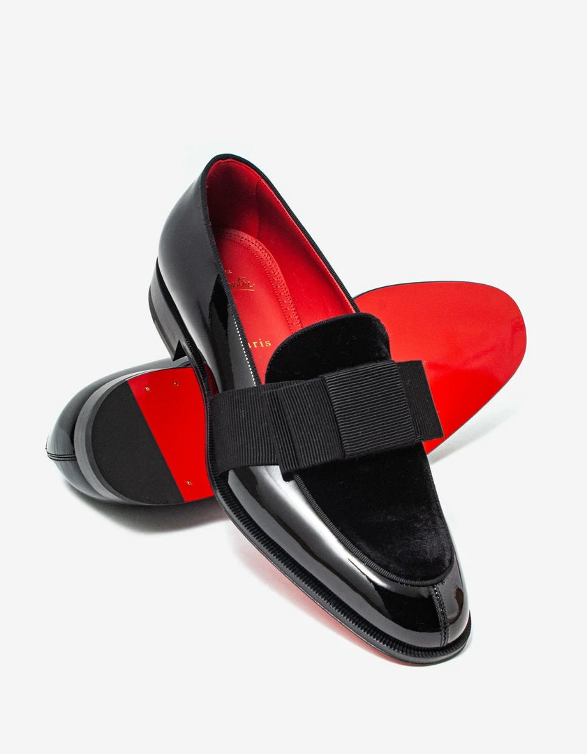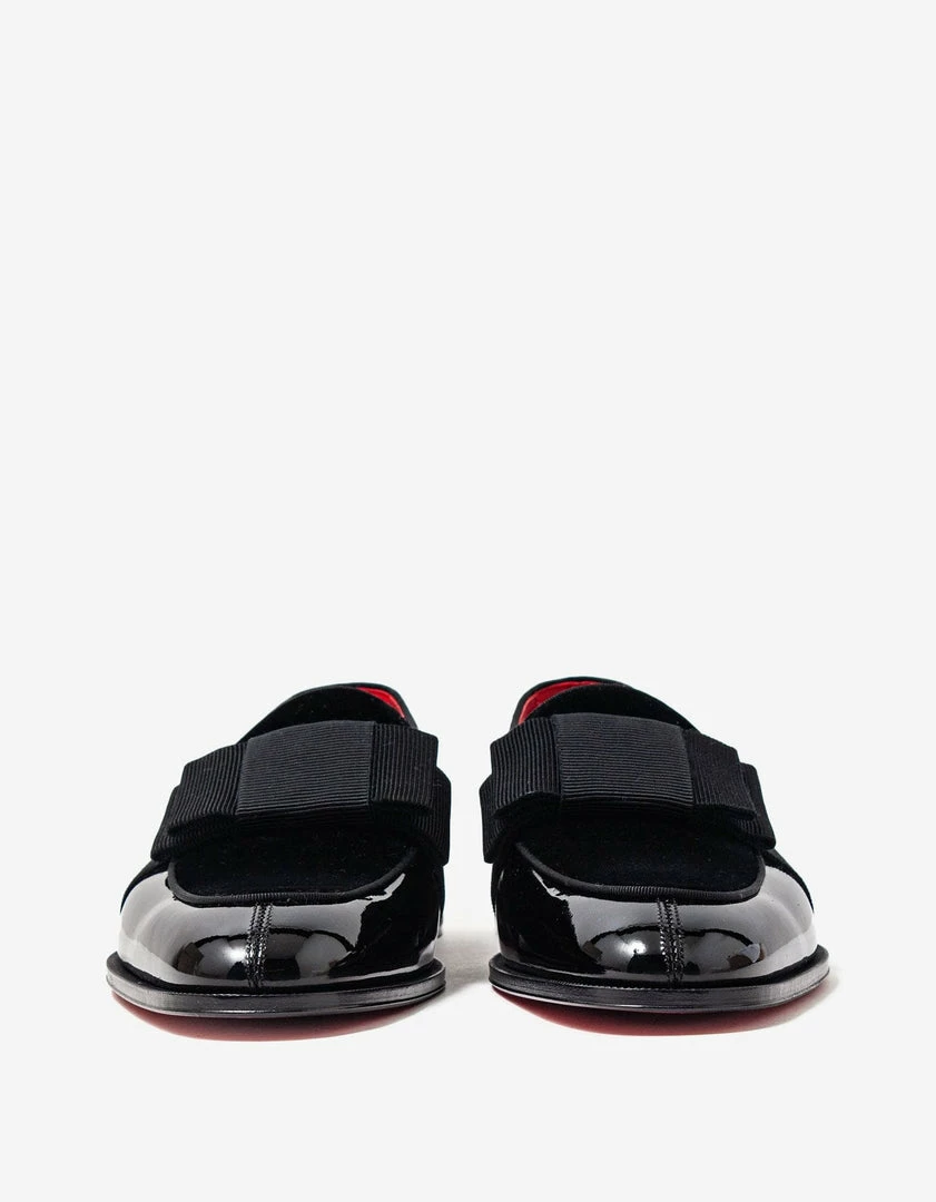 The Styleeto is Maison Christian Louboutinโs couture loafer, a dress shoe that most definitely wonโt go unnoticed. Crafted in all-over black for an elegant appeal, it features a shaft in patent calfskin and velvet, edged with a grosgrain ribbon trim and lined with loubi red leather. A striking, oversized grosgrain ribbon bow adorns the upper, adding dramatic flair.