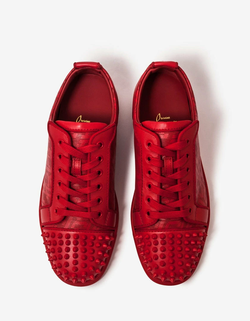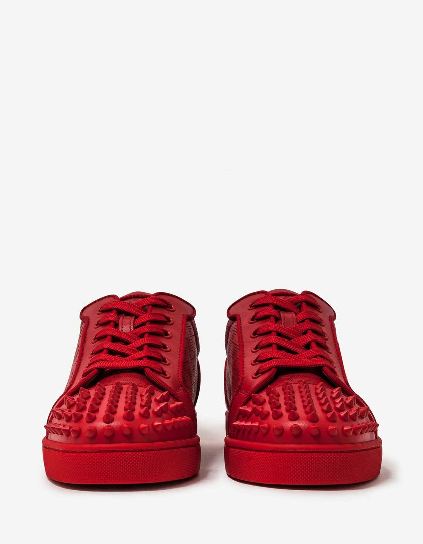 The Louis Junior Spikes Orlato Flat low top trainers is inspired by basketball, blending sporty and elegant lines. It has a nude interior and is crafted in calf leather and soft Loubi red Techno leather with CL initial perforations. This contemporary model has a heel tab and delicate topstitching, it also features Maison Christian Louboutin signature tonal spikes.