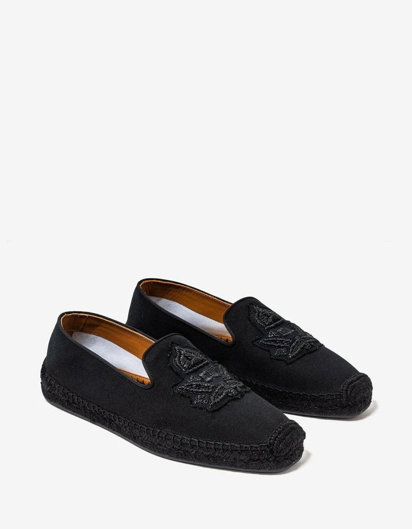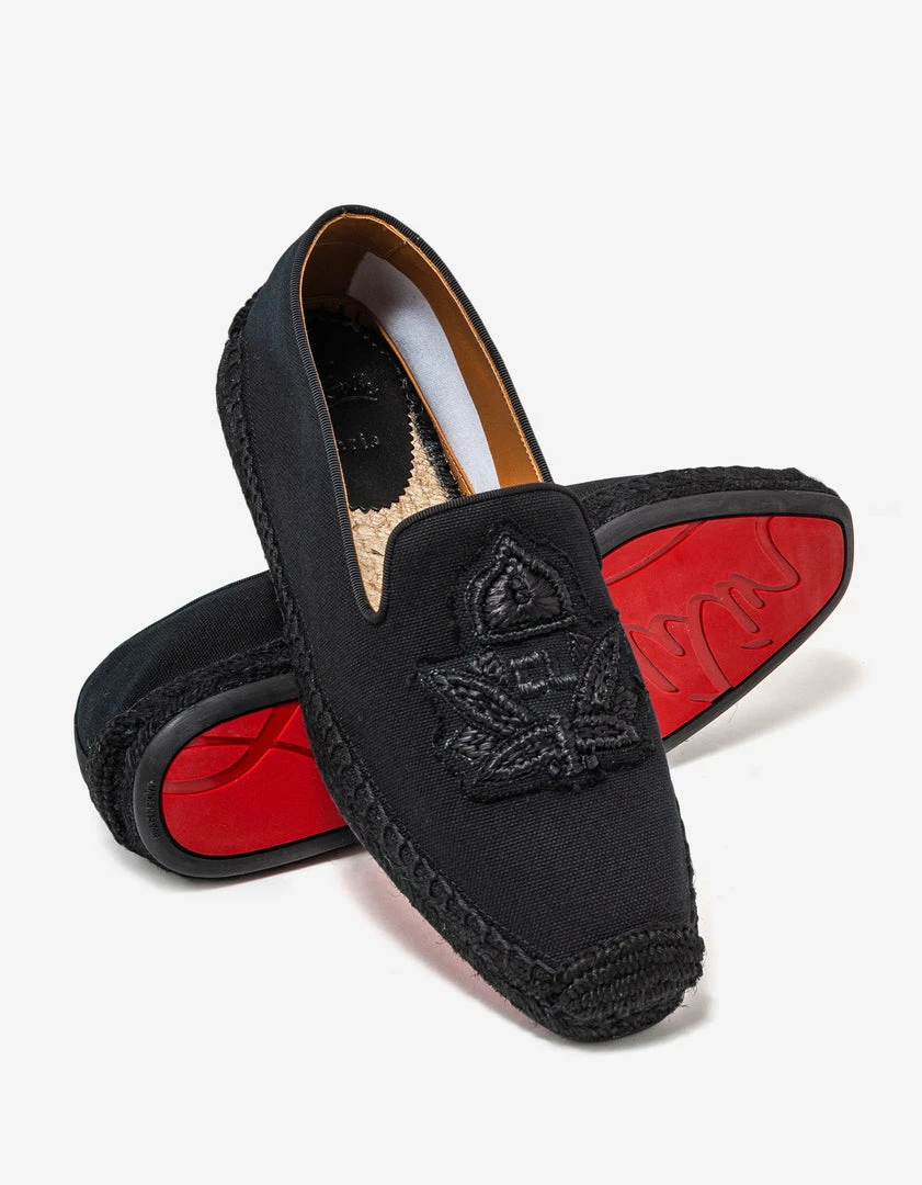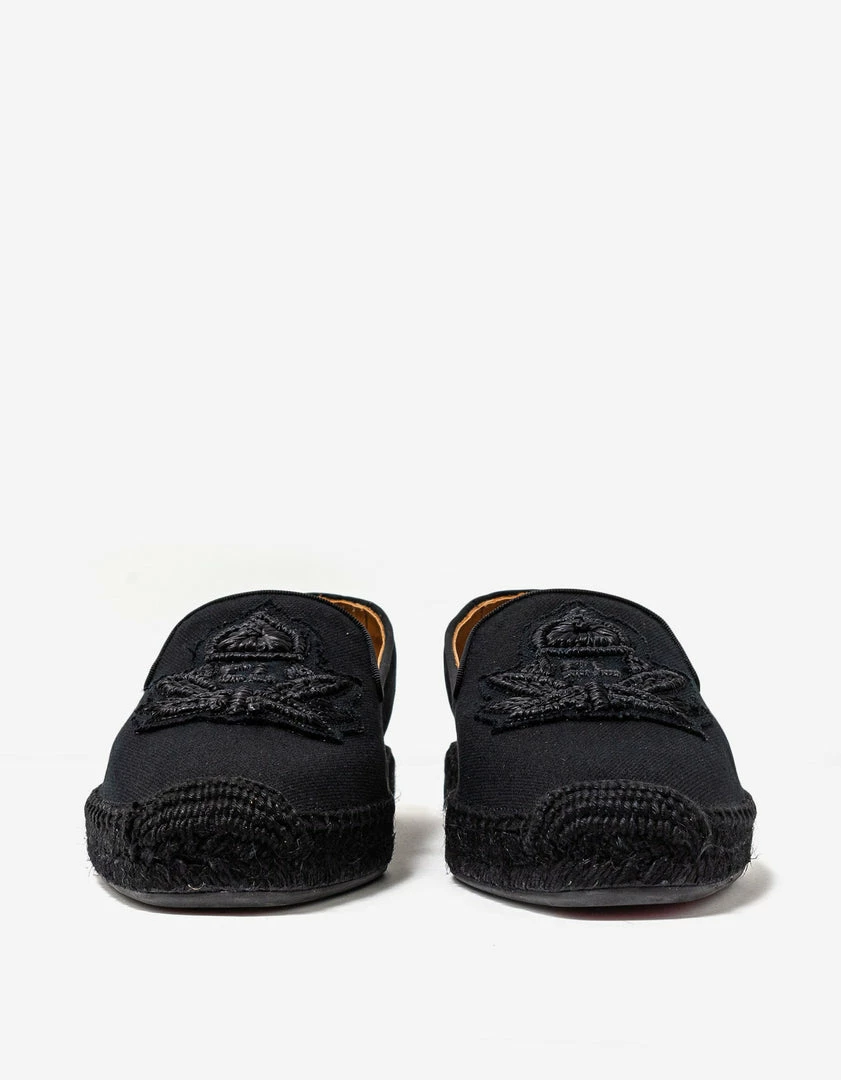 A modern, audacious twist on the classic espadrille, the Nanou Max is enchantingly elegant. Set on a rope sole, this black shoe is crafted in cotton canvas. The upper is adorned with tone-on-tone embroidery showcasing the signature Maison Christian Louboutin CL logo. This elegant style is highlighted with black grosgrain piping.