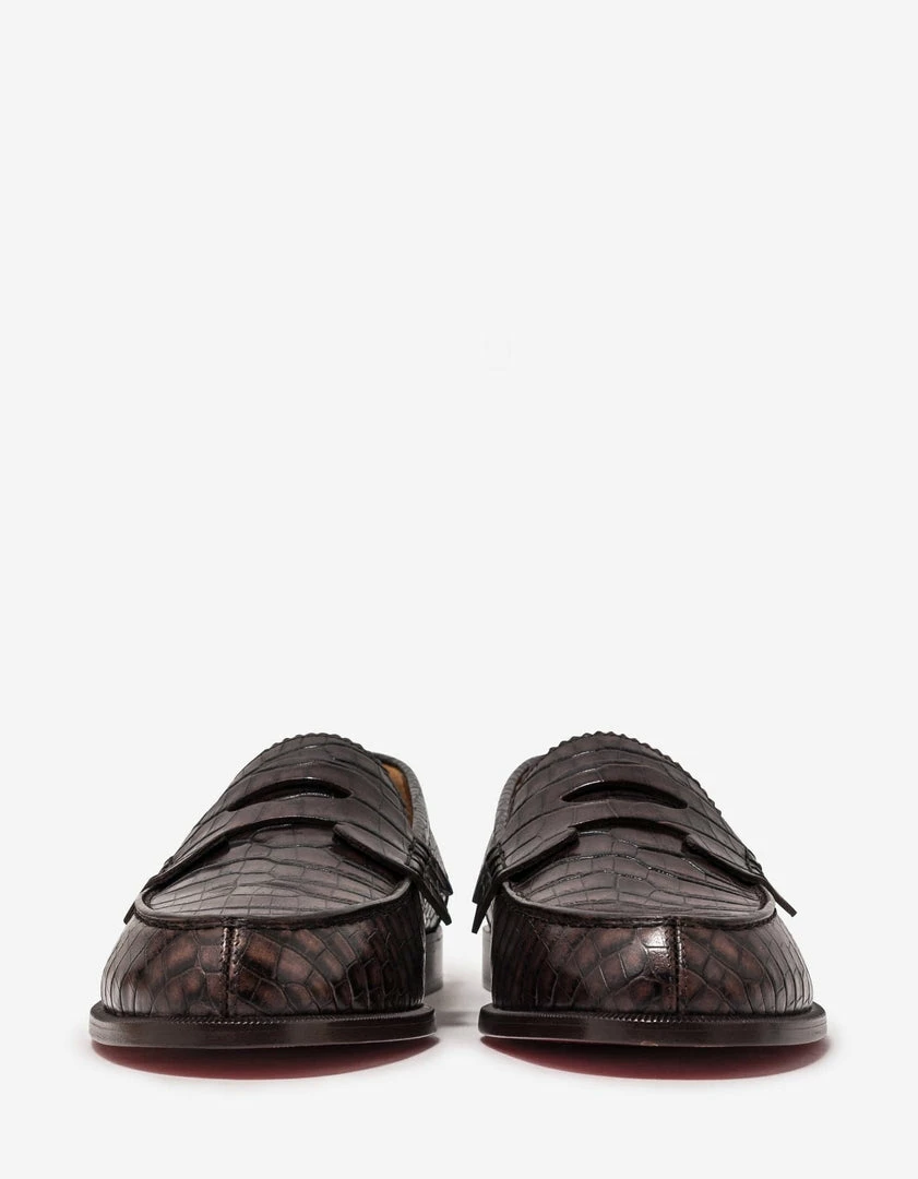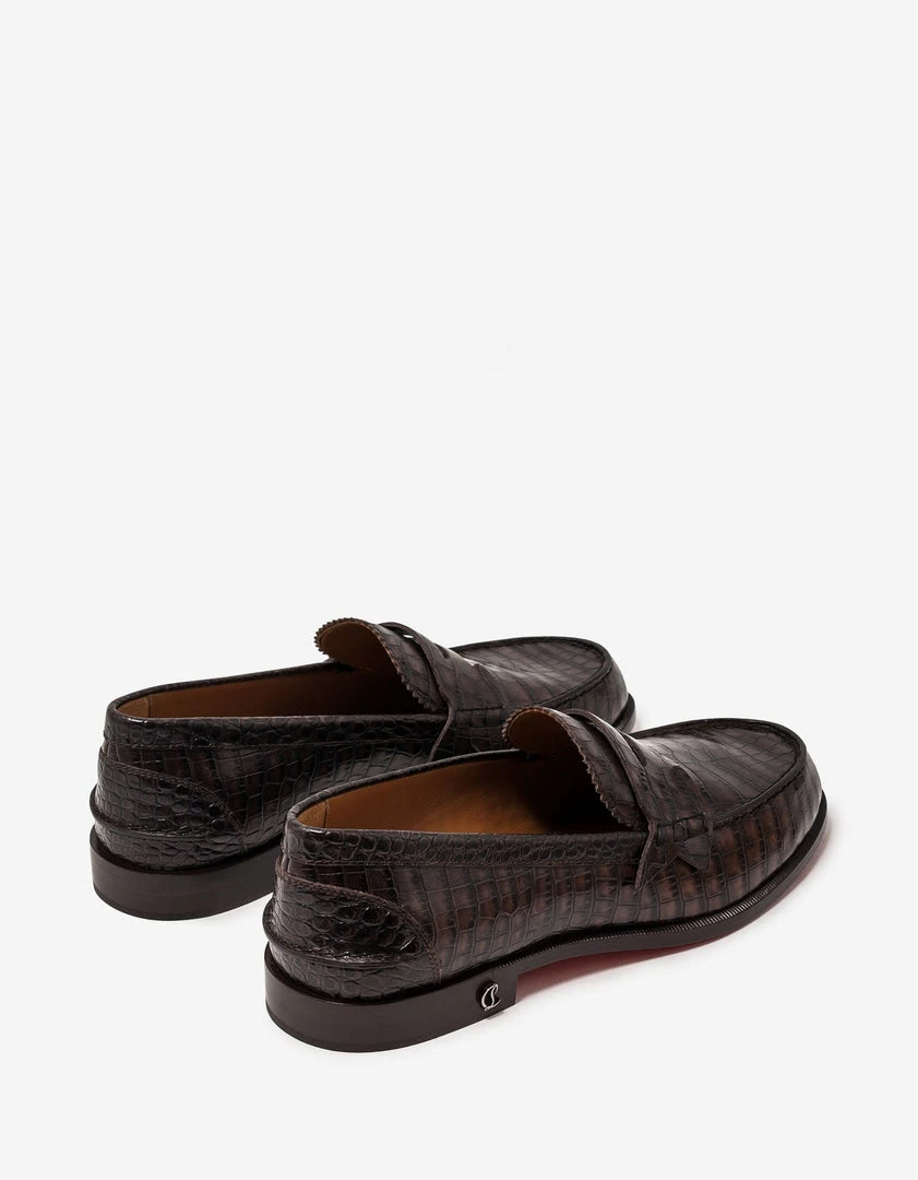 The timeless No Penny loafer takes inspiration from traditional penny loafers that can hold a coin. This model has a serrated tongue and is crafted in mini-croc Expresso brown calf leather. A delicate Maison Christian Louboutin style with a CL monogram on the heel.