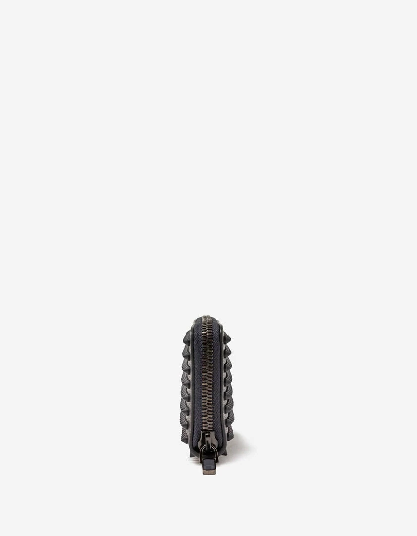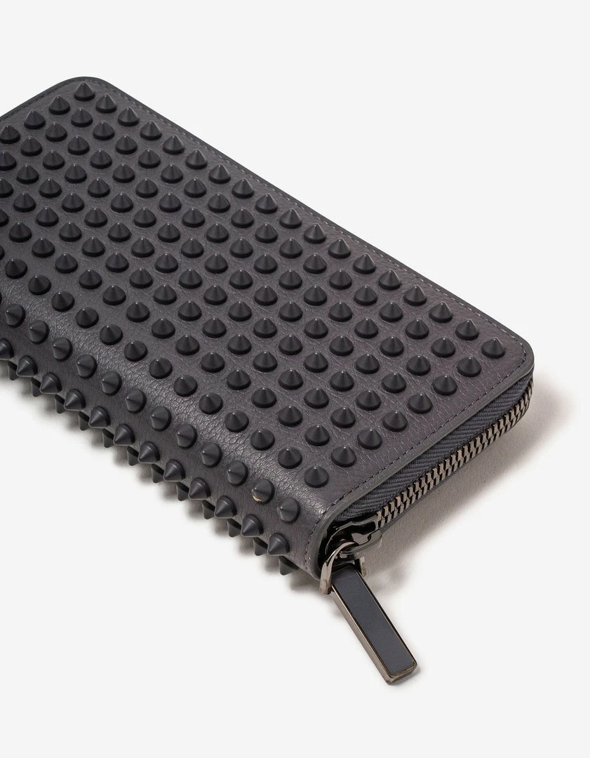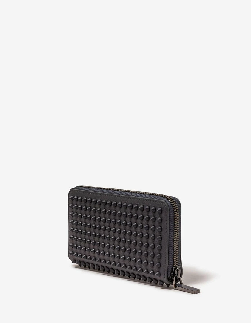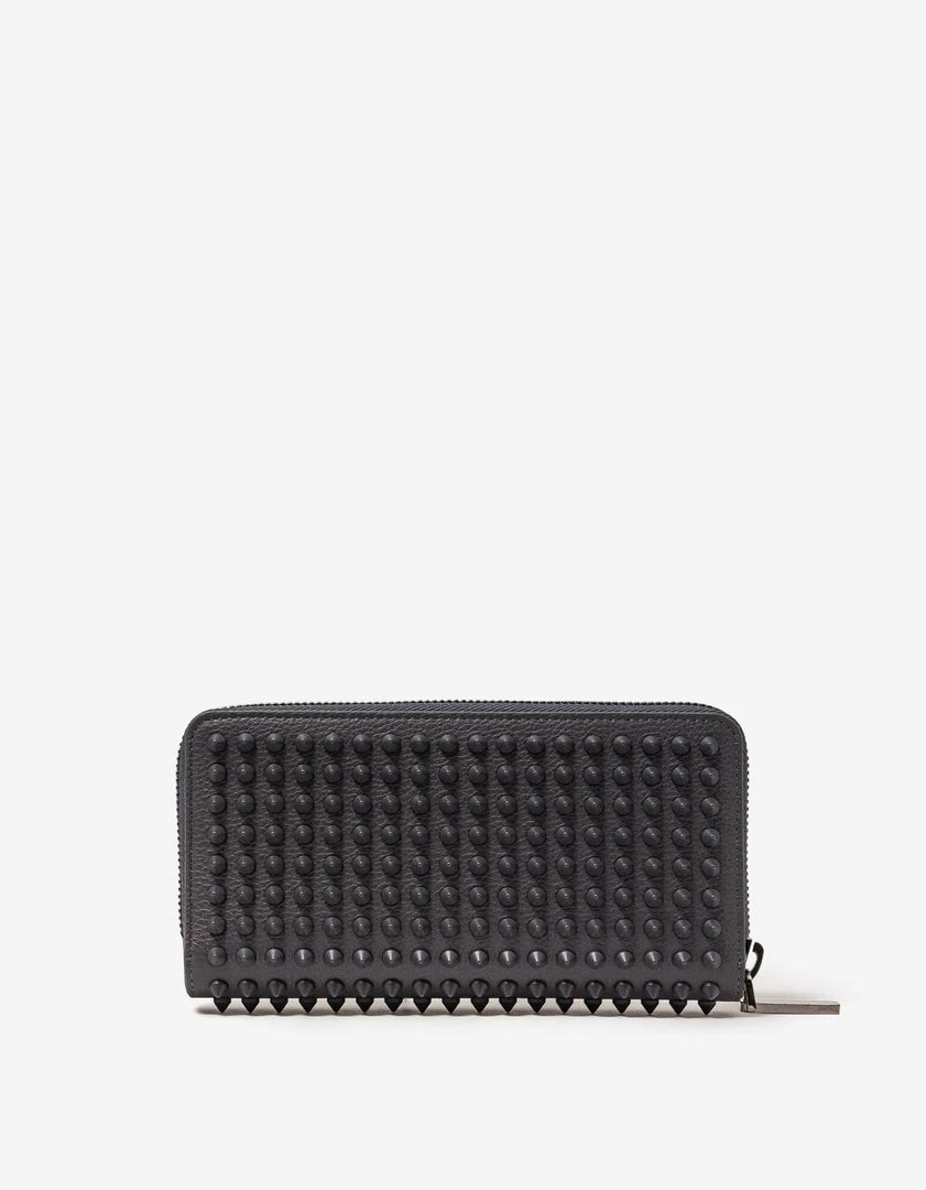 Thisย Smoky greyย ‘Panettone’ grain leather wallet from Christian Louboutin features signature spike embellishment throughout the exterior and a gunmetal zip-around body with an iconic red zipper pull. The red leather interior contains ample storage space for cards, cash and other small essentials. Complete with logo embossing detail at the interior.