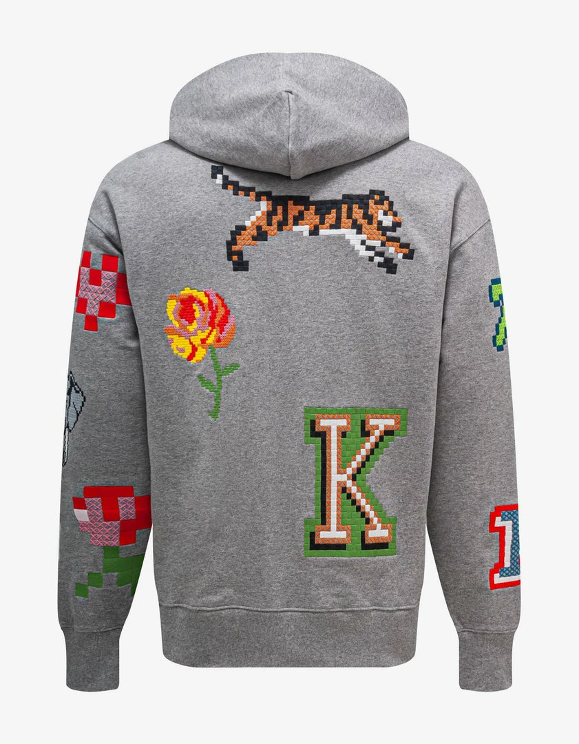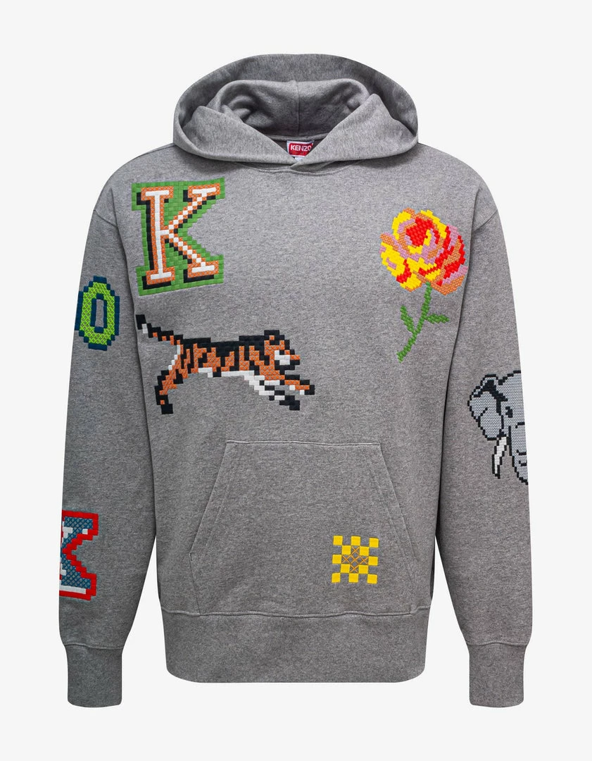 This hoodie’s embroidered all-over ‘KENZO Pixel’ motif celebrates the 1980s computer revolution. It features the emblematic Tiger, Elephant and K signatures. Worn with straight trousers, this original piece will be the centrepiece of a streetwear outfit.