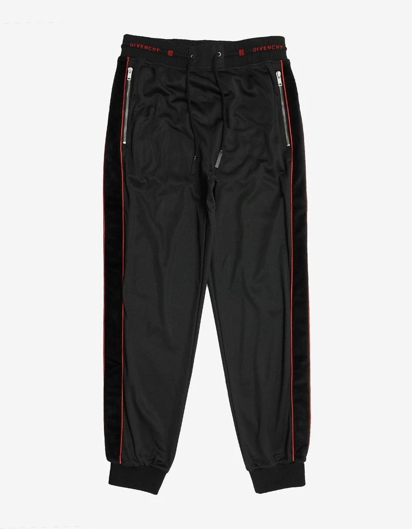 - Tonal velvet bands and red piping along the sides