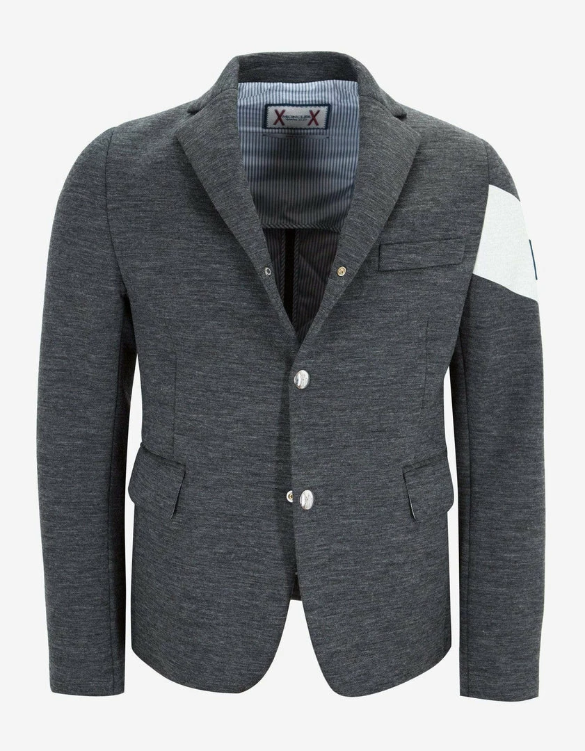 This grey wool down-padded jacket from Moncler Gamme Bleu features a blazer-inspired appearance with a contrasting white stripe on the left sleeve. Includes three front pockets, two inside pockets, logo-engraved, silver-tone pop stud front closure and pop stud cuffs. Complete with a signature Gamme Bleu badge on the left sleeve, a tricolour label at the neck rear and a double vent to the rear hem.