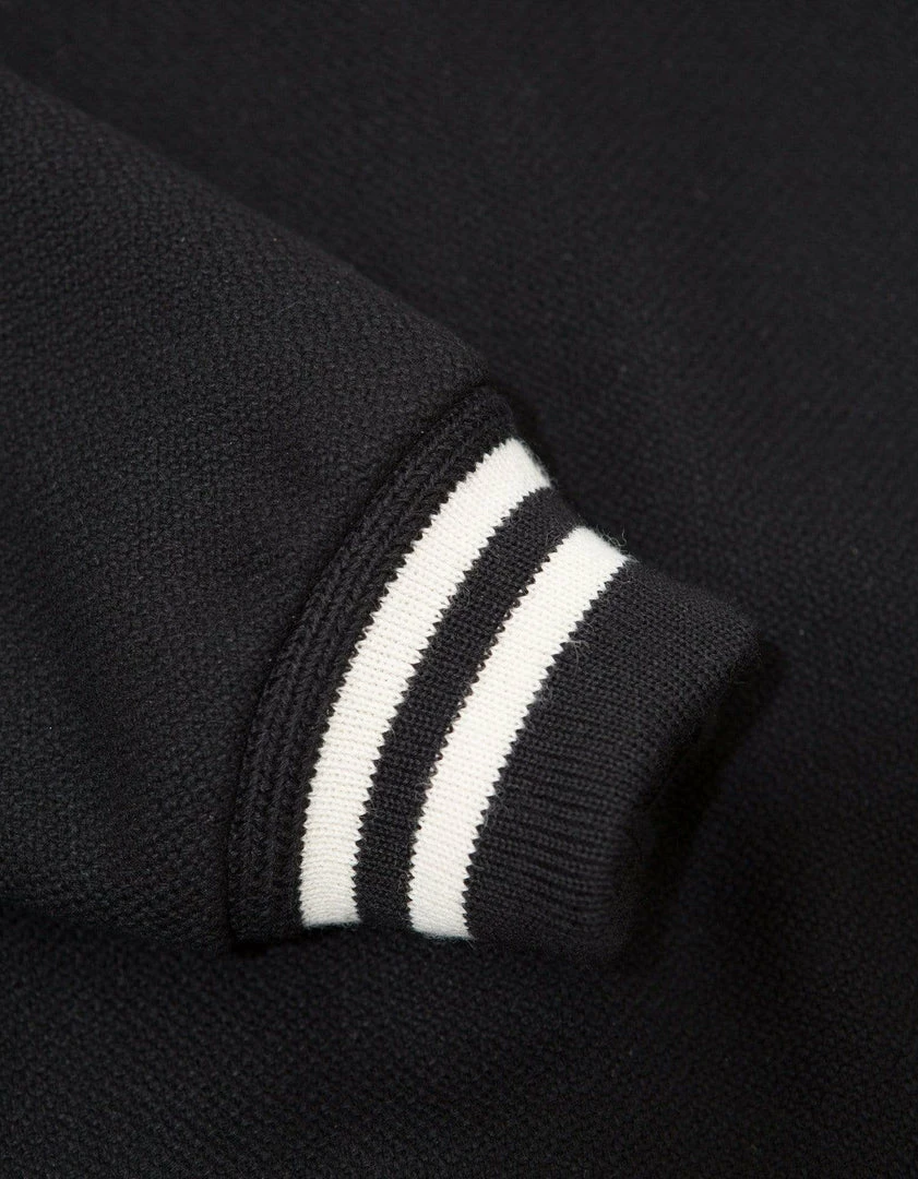 - Contrasting white leather trim detail at the shoulders and front slash pockets