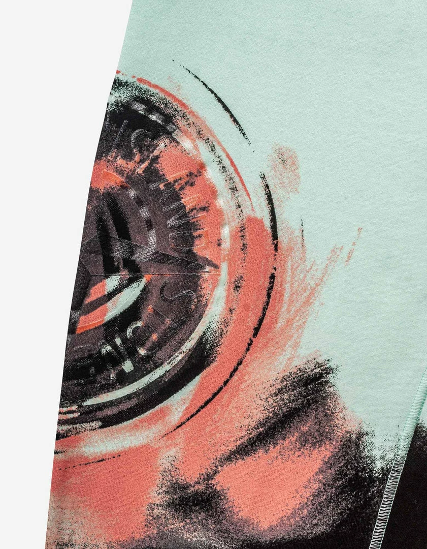 - Mixed printing techniques on the finish piece, including coloured corrosion, forming the Stone Island Compass logo, and a brushed rotational motif