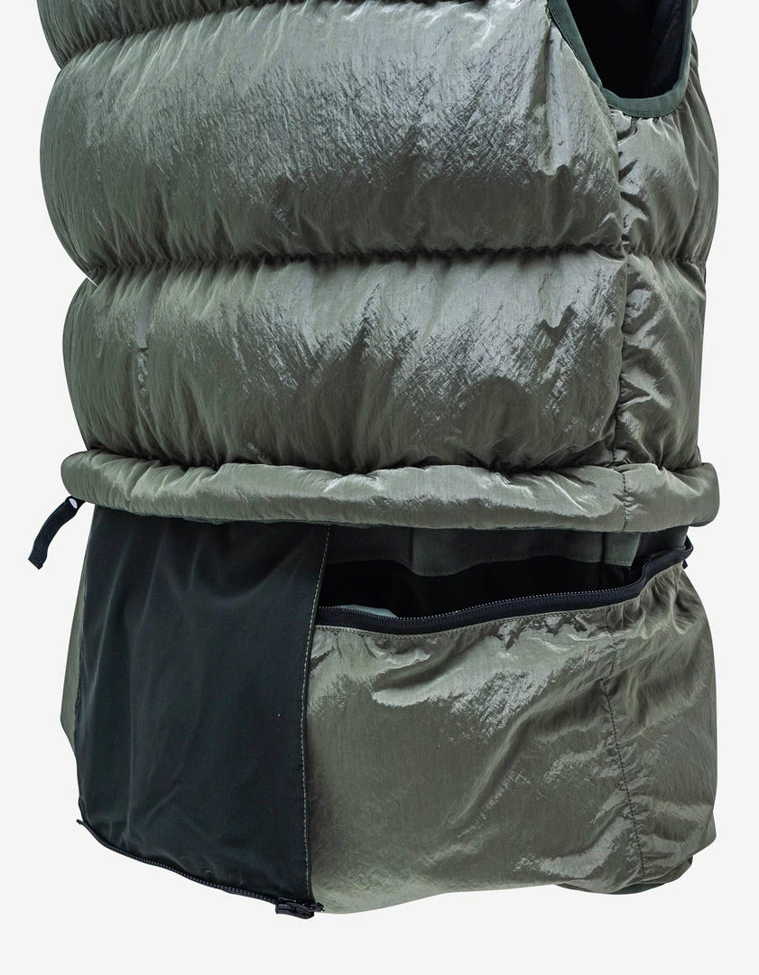 - A horizontal zip at the waist running around the gilet secures the pouch meant to pack away the Paclite® parka