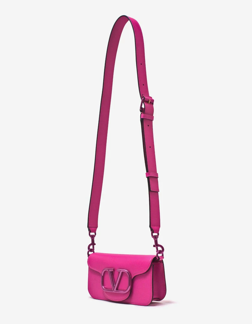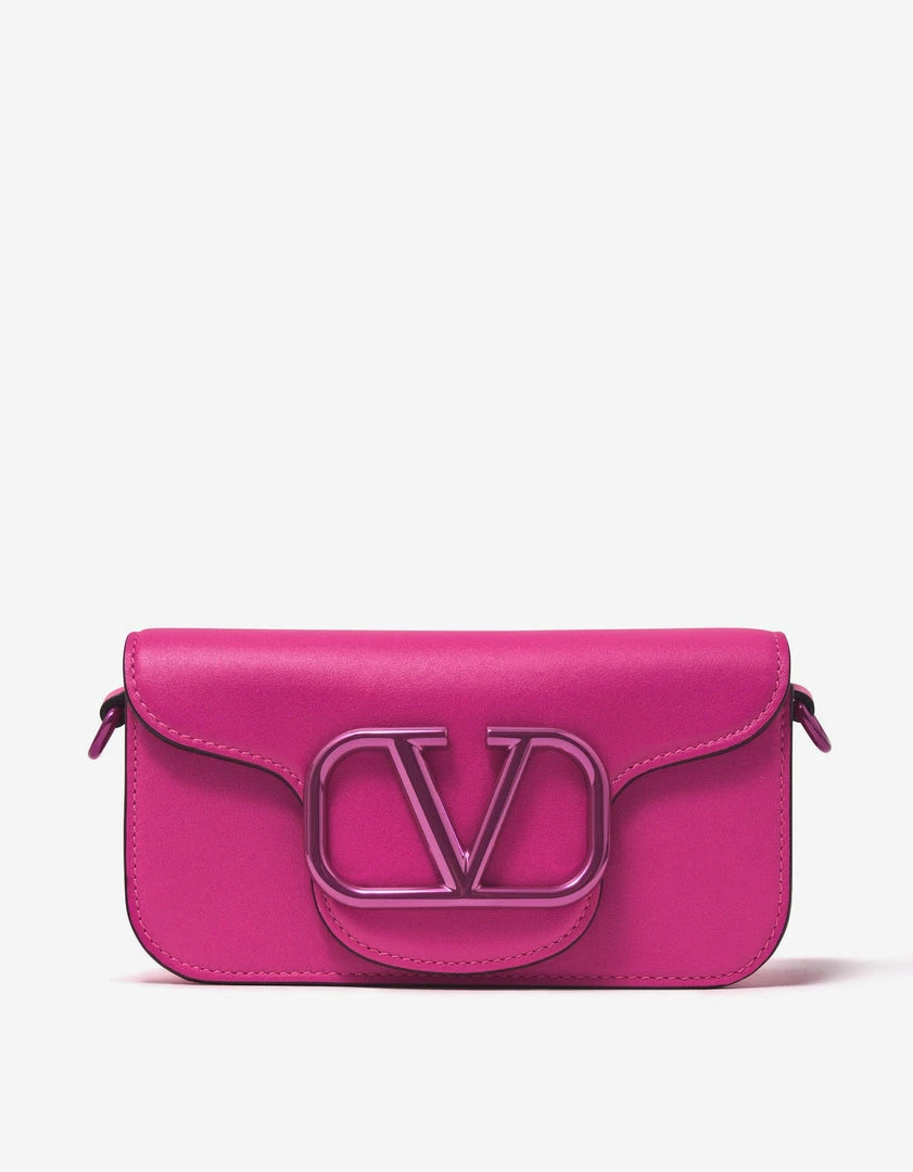 Valentino Garavani Locò mini crossbody bag in calfskin leather with metallic VLogo Signature element. The bag can be handheld or worn on the shoulder/crossbody, using the handle or shoulder strap, both of which are adjustable and removable