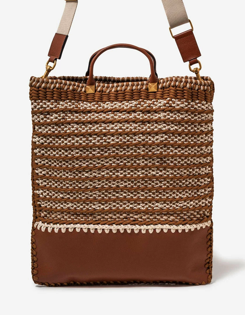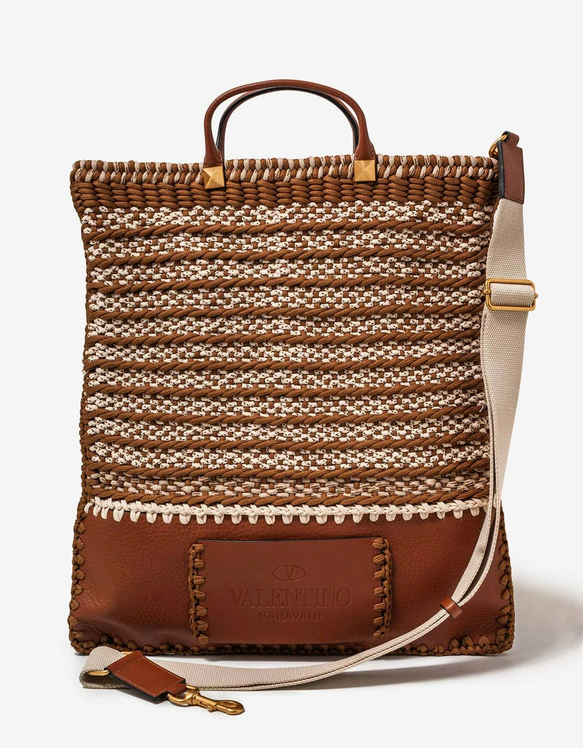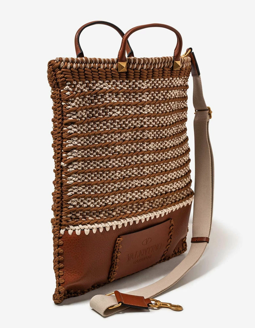 - Woven crochet and grain leather flat tote bag