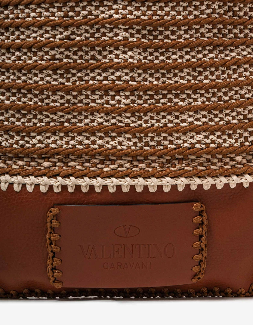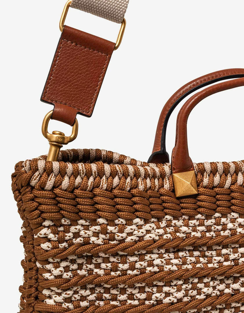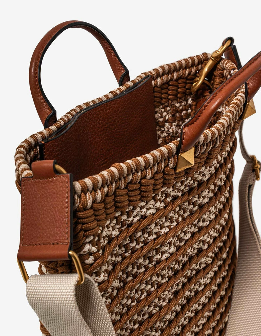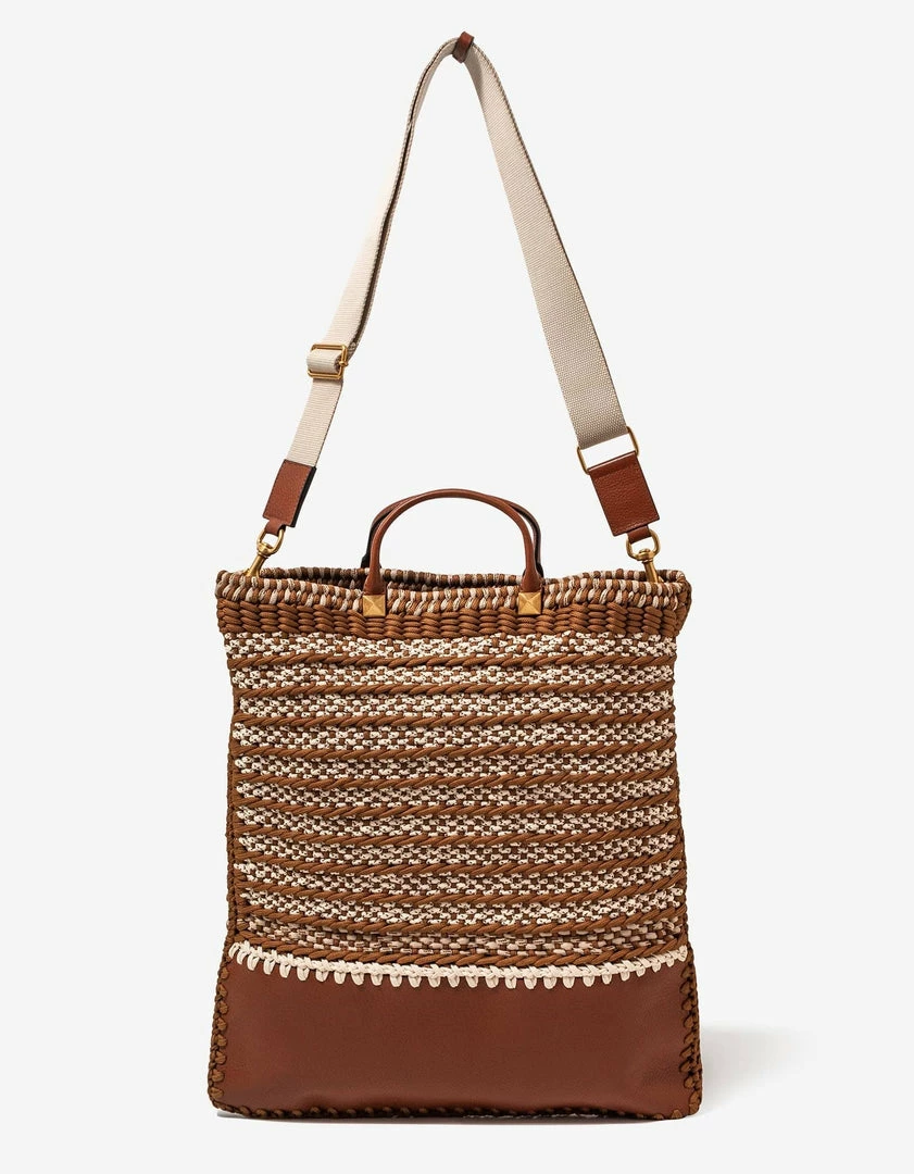 - Woven crochet and grain leather flat tote bag