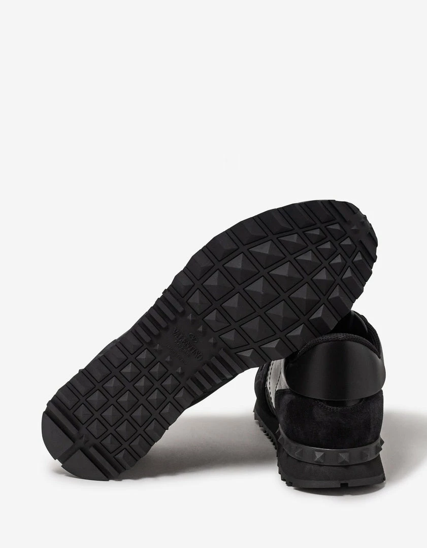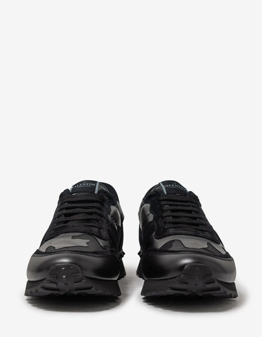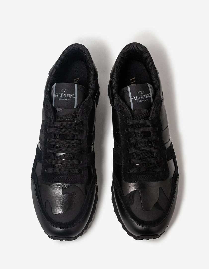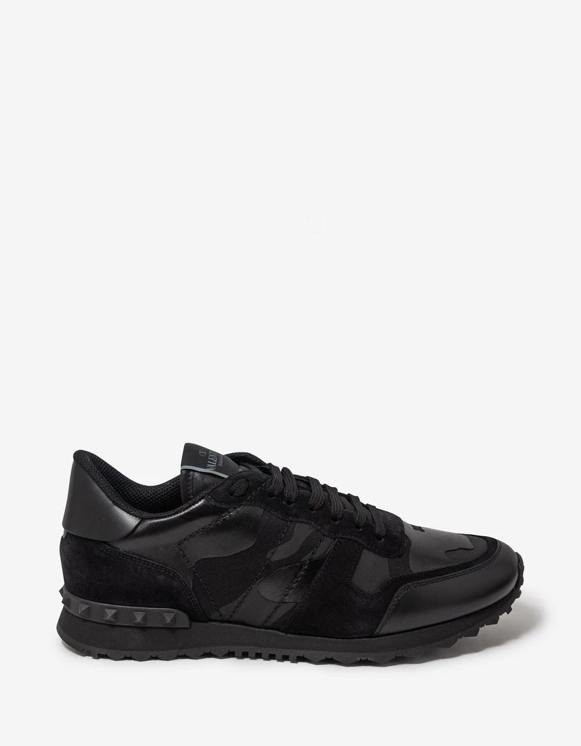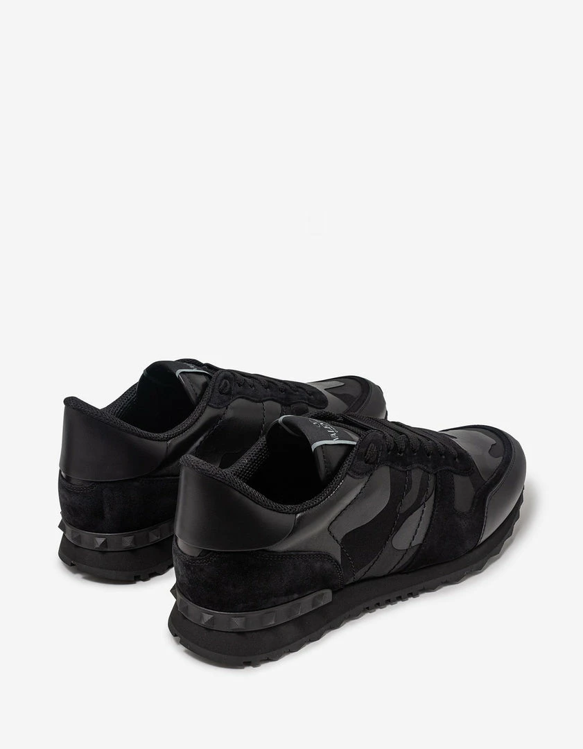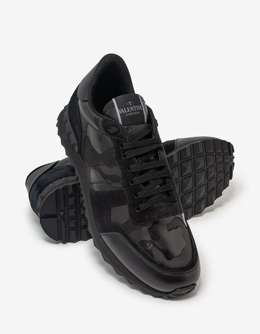 These Rockrunner trainers from Valentino Garavani feature a black ‘Camouflage Noir’ leather and canvas upper. Complete with black suede leather accents, rubber Rockstud embellishments to the heel and a studded rubber sole.