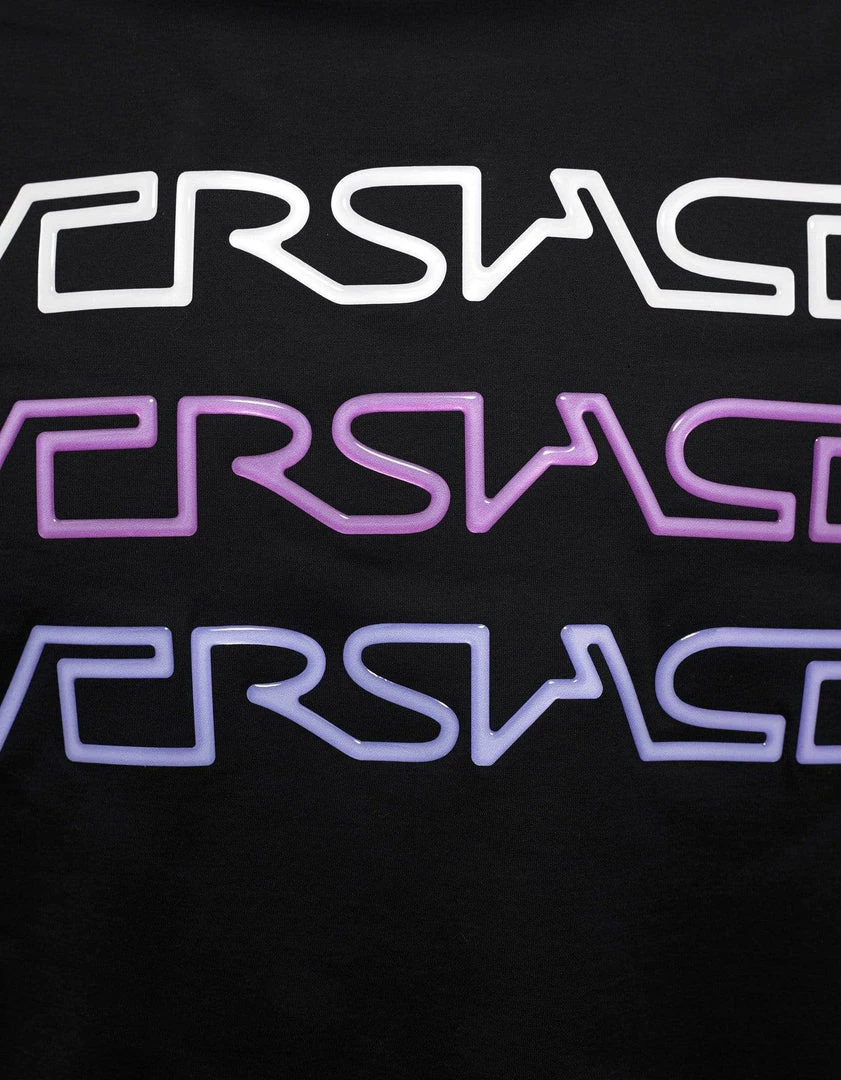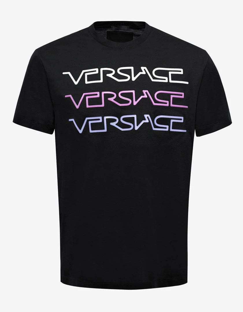 This black t-shirt from Versace features neon-style, rubberised logo print detail on the front. Complete with a Versace logo badge at the upper back.