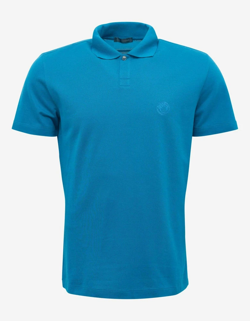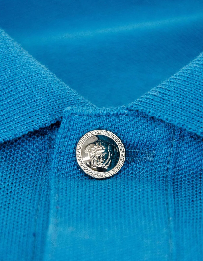 This blue polo t-shirt from Versace features iconic Medusa embroidery at the chest. Complete with a Medusa embossed neck button.